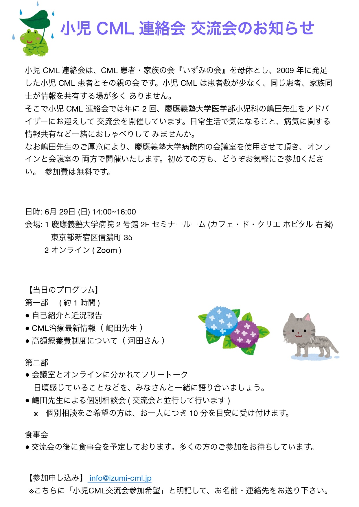 本会は、慢性骨髄性白血病(CML)の患者と家族の情報交換や、治療の向上のための活動を目的とします。私たちは孤独な治療を続けていますが、同じ環境にある者同士が話し合い支え合い、楽しみながら「いきいき生きよう」をモットーにしています。小児CMLの情報も公開。
